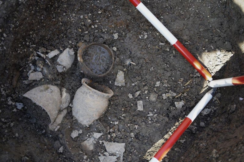 Za zcela mimořádný lze pak považovat nález učiněný na samém závěru výzkumu, a to objev kamenné destrukce velkomoravského stáří pojené kvalitní maltou. Destrukce pochází ze stavby neznámé funkce. Petrografická analýza použitých pískovců potvrdila, že se jedná o materiál regionálního původu. Kamenné zdivo bylo zčásti druhotně využito v období středověké kolonizace města ke zpevnění cesty mezi hatěmi. Stavba, s níž lze pojit i nálezy zdiva, stála původně patrně severně od výkopu a nacházela se v hloubce 2,1–2,6 m od současné úrovně povrchu. Do souvislosti s ní lze dát i nález zlomku střešní krytiny antického charakteru. Datování stavby je podpořeno nálezy středohradištní keramiky v rámci destrukce. Jedná se o nádoby s typickou výzdobou, včetně výzdoby s využitím vícehrotých rydel.